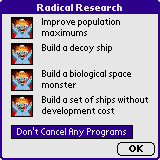 The Cancel Radical Research Program dialog. Here the user can select one of the radical research programs to cancel, thereby concentrating radical research dollars on a smaller list of programs.