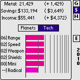 By selecting the Tech button, the user can show the spending levels for each technology. Just as with the planets spending screen, the tech levels can be adjusted by clicking on a particular bar and dragging to the left or right or simply click at the location desired for the bar and it will jump to that value.