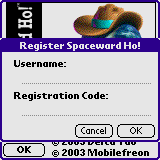 The Palm OS version of Spaceward Ho! plays much the same way as the Macintosh/PC version. After launching the game for the first time, you will be presented with the About box. If you have already purchased Spaceward Ho! for Palm OS you can enter your registration code now to unlock the game. Click the Register button and enter your Username and Reg code.