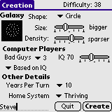 If you registered your copy of Spaceward Ho!, once you leave the About screen you will see the Creation screen. This screen provides all of the currently available options that the user can use to customize the type of game they would like to play. Note: not all options are available. Additional features are made available after you accumulate master points from winning games. The more difficult the game, the more points you are awarded if you win. Click the Create button to start the game.