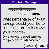 The Dip Into Savings dialog. The user can decide to dip into their savings to supplement their income if they do not have enough money to do what they need to do. On the Spending Screen, the Savings bar will be disabled and it will show how much is being pulled from savings to supplement your income.