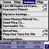 There are four menus that can be accessed from the Galaxy Screen (if you tap the menu soft-button from the Spending or History Screen, you will be moved to the Galaxy Screen and the menu activated).