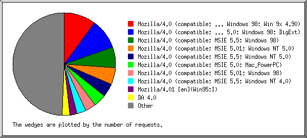 | 6 | 1.30% | 15 | 0.52% | 0.03 | 0.05% | Mozilla/4.0 (compatible; MSIE 5.5b1; Mac_PowerPC) |