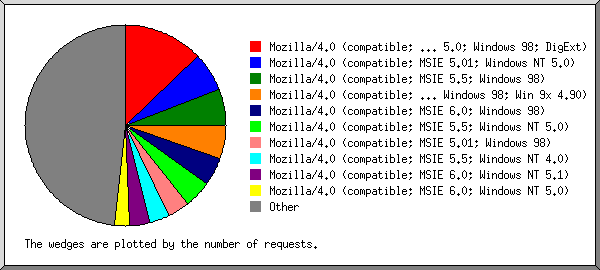 | 5849 | 13.25% | 13591 | 12.89% | 41.21 | 11.01% | Mozilla/4.0 (compatible; MSIE 5.0; Windows 98; DigExt) |
