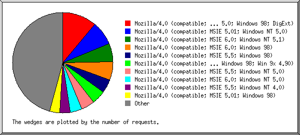 | 3722 | 11.51% | 8585 | 11.13% | 26.20 | 9.78% | Mozilla/4.0 (compatible; MSIE 5.0; Windows 98; DigExt) |