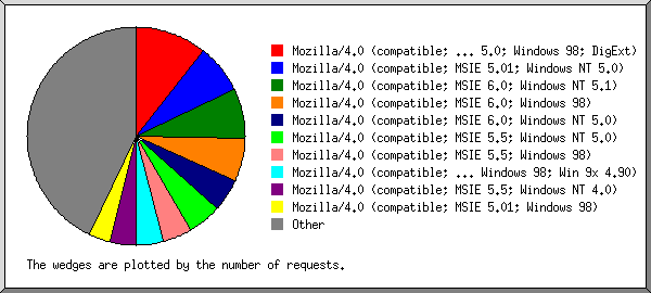 | 148 | 0.42% | 352 | 0.43% | 1.27 | 0.51% | Mozilla/4.0 (compatible; MSIE 5.01; Windows 95) |