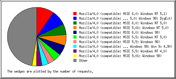| 453 | 0.95% | 1039 | 0.95% | 2.78 | 0.90% | Mozilla/4.0 (compatible; MSIE 5.01; Windows NT) |