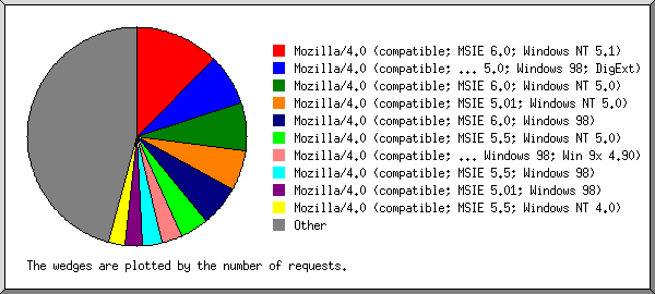 | 275 | 0.76% | 623 | 0.75% | 1.60 | 0.66% | Mozilla/4.0 (compatible; MSIE 5.01; Windows NT) |