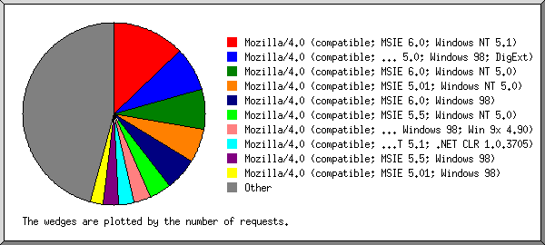 | 2681 | 7.60% | 6183 | 7.64% | 17.07 | 7.47% | Mozilla/4.0 (compatible; MSIE 5.0; Windows 98; DigExt) |