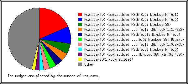 | 202 | 1.13% | 1604 | 1.22% | 10.13 | 1.43% | Mozilla/4.0 (compatible; MSIE 6.0; Windows NT 5.1; .NET CLR 1.0.3705; .NET CLR 1.1.4322) |