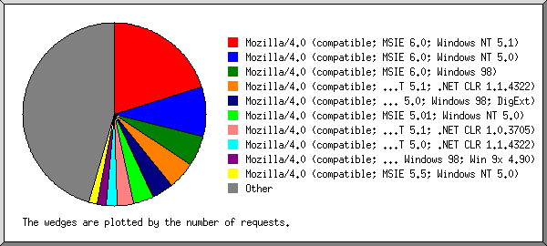 | 68 | 0.49% | 458 | 0.44% | 3.88 | 0.65% | Mozilla/4.0 (compatible; MSIE 6.0; Windows NT 5.0; .NET CLR 1.0.3705; .NET CLR 1.1.4322) |