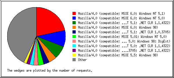 | 40 | 0.21% | 323 | 0.24% | 1.96 | 0.31% | Mozilla/4.0 (compatible; MSIE 6.0; Windows NT 5.1; .NET CLR 1.1.4322; .NET CLR 1.0.3705) |
