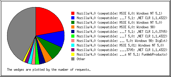 | 40 | 0.23% | 441 | 0.26% | 2.26 | 0.20% | Mozilla/4.0 (compatible; MSIE 6.0; Windows NT 5.2; .NET CLR 1.1.4322) |
